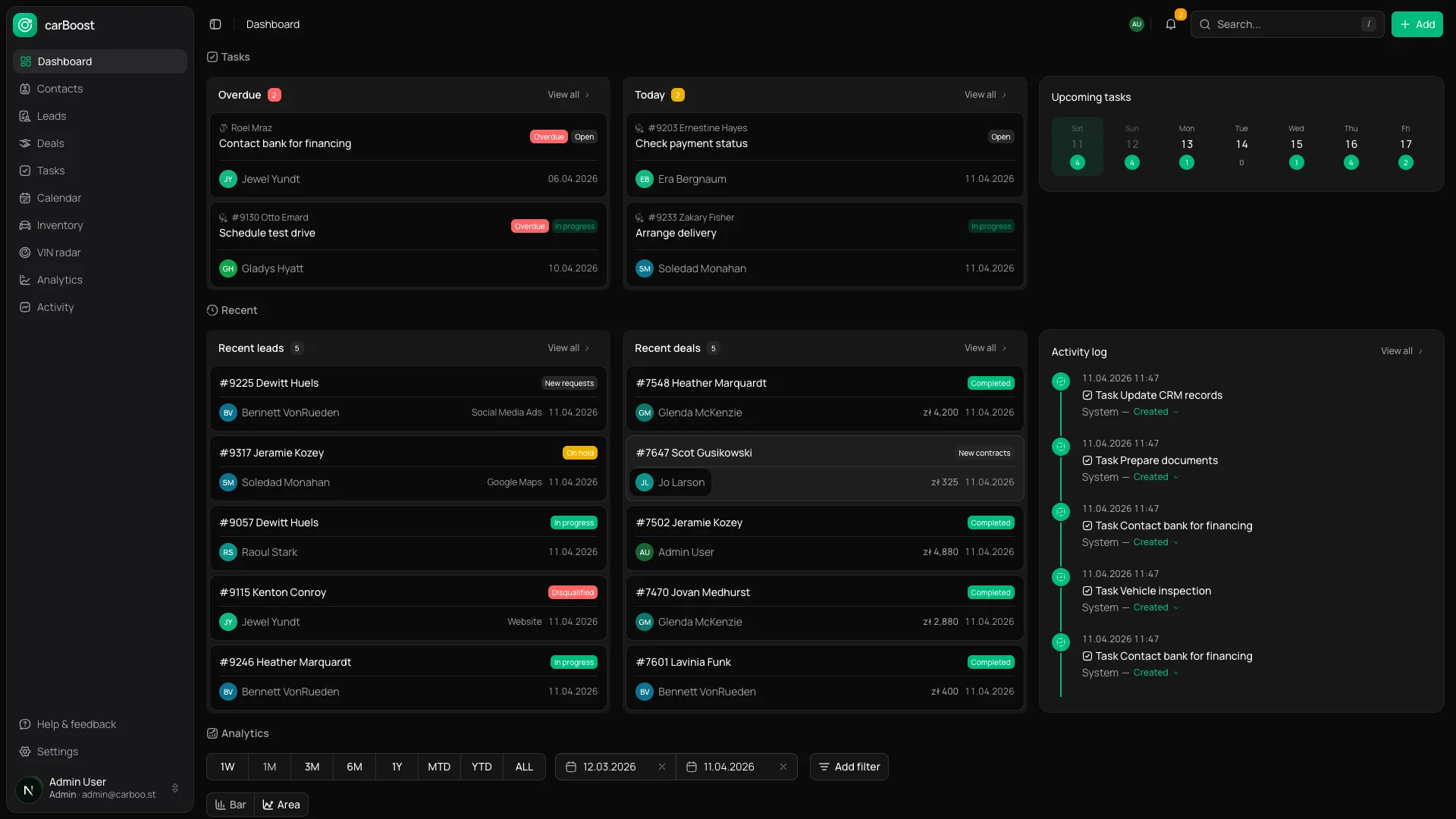 Si vous voulez voir comment organiser les importations, les stocks et les ventes en un seul endroit, vérifiez CarBoost. C'est une solution pour les concessionnaires et les importateurs qui veulent avoir le contrôle de VIN, le statut de véhicule, le plomb et la rentabilité sans coller les données entre Excel, email et communicateurs.